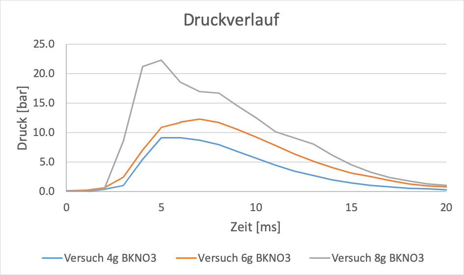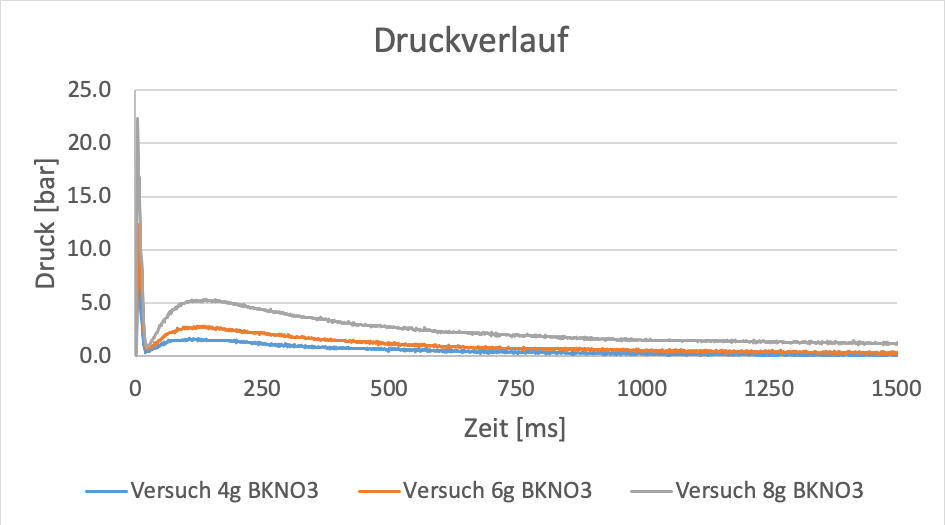 Kurz nach der Zündung steigt der Druck rasch an und bricht sofort wieder ein. Der zweite Anstieg erreichte ein deutlich geringes Druckmaximum, jedoch benötigen die Verbrennungsgase einige Zeit bis sie den Testaufbau durch die Düse verlassen haben. Beim letzten Versuch mit 8g ist das Druckniveau am Ende höher als erwartet, weil der Deckel aufgedrückt wurde und der Drucksensor den Umgebungsdruck misst.