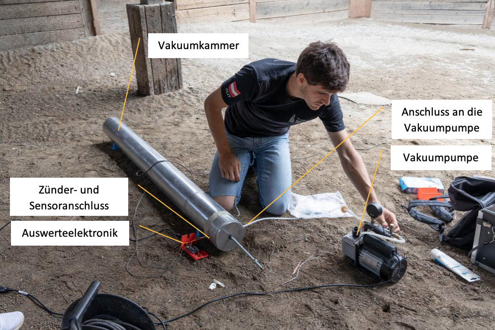 Die zweite Randbedingung ist der Umgebungsdruck. Die geplante Höhe in der „The Hound“ die zweite Stufe zündet ist bei etwa 10km. Auf dieser Höhe herrscht ein Umgebungsdruck von etwa 0,25bar. Um diese Bedingungen zu simulieren, ist es notwendig den Umgebungsdruck des Testaufbaus in eine Vakuumkammer abzusenken. Die verwendete Vakuumkammer hat ein signifikant größeres Volumen, damit der Druck in der Vakuumkammer während der Verbrennung nur geringfügig ansteigt.