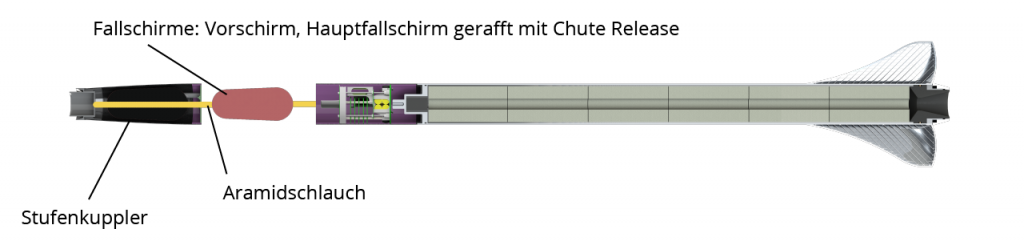 2. Eine Reffung für den Fallschirm. Die Reffleine wird durch 8 Ringe, die entlang des Umfangs des Fallschirms eingenäht sind, gefädelt. 400 Meter über dem Boden wird die Leine von einem Linecutter gekappt, der Fallschirm kann sich jetzt zur vollen Größe entfalten. Die Rakete kommt also mit nur einem Fallschirm aus, ein separater Drogue wird nicht benötigt.