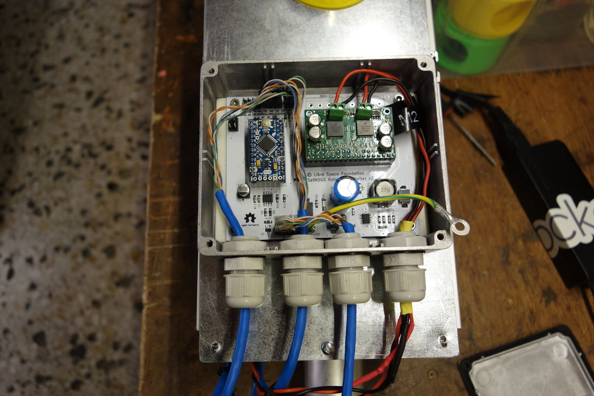 SatNOGS ist ein weltweites Netzwerk von Bodenstationen, das die Daten von verschiedenen CubeSats verfolgt und empfängt. So ist es möglich, die ganze Zeit über Beacons und Daten zu empfangen. Diese Daten können dann über den SatNOGS-Server zur weiteren Verarbeitung abgerufen werden. Die Nutzung dieser Infrastruktur ermöglicht es uns, den Status unseres CubeSats ständig zu analysieren, was die Möglichkeiten der Kommunikation erheblich verbessert. Da das gesamte SatNOGS-Projekt ein Open-Hardware-Projekt ist, ist der Bau einer eigenen SatNOGS-Bodenstation gut und detalliert dokumentiert beschrieben bzw. dokumentiert. Dies ermöglicht es auch Schülern, ihre eigene Bodenstation an ihren Schulen zu bauen und ihre CubeSat-Kenntnisse weiter auszubauen. Außerdem kann mit ungefähren Kosten von €500 eine recht günstige Bodenstation aufgebaut werden. Bislang haben wir bereits mit der Elektronik für die Rotorstruktur begonnen, die notwendig ist, um den CubeSat zu verfolgen und ihm zu folgen. Dazu gehört auch die Leistungselektronik für den Antrieb und die Steuerung der verwendeten Schrittmotoren. Unsere Maschinenbauer haben mit der Arbeit am Gehäuse begonnen, das wasserdicht sein muss, da die Bodenstation natürlich im Freien platziert werden muss. Außerdem haben die Arbeiten an unserer Helix-Antenne begonnen.