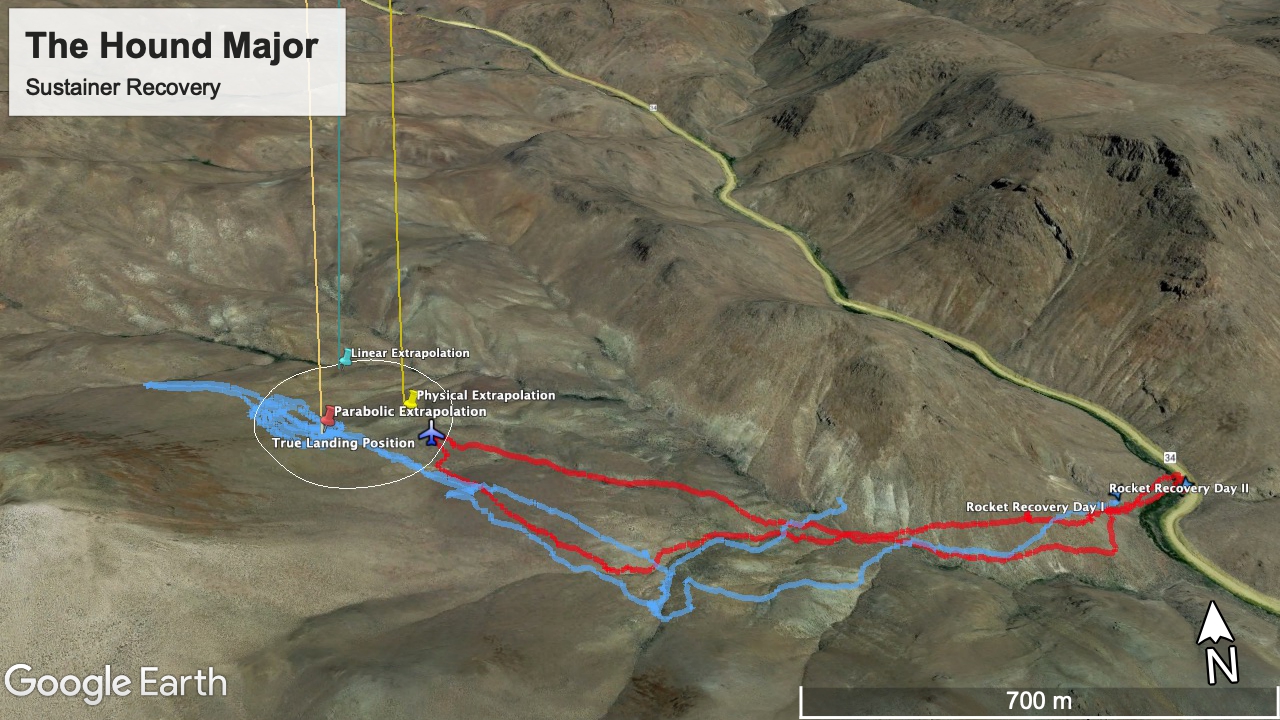 Since the lower stage again landed nominally on the parachute, it was recovered just as quickly. The upper stage on the other hand landed ballistically, i.e., without a parachute and the exact landing coordinates were unknown. Based on the coordinates last received via radio, possible landing points were estimated and on the second day the search party found it. The search party was not able to locate the rocket at the first attempt. After some late-night recalculations of the landing estimations, the search party found the rocket the next day, only 100 m nearby one of the calculated landing positions.